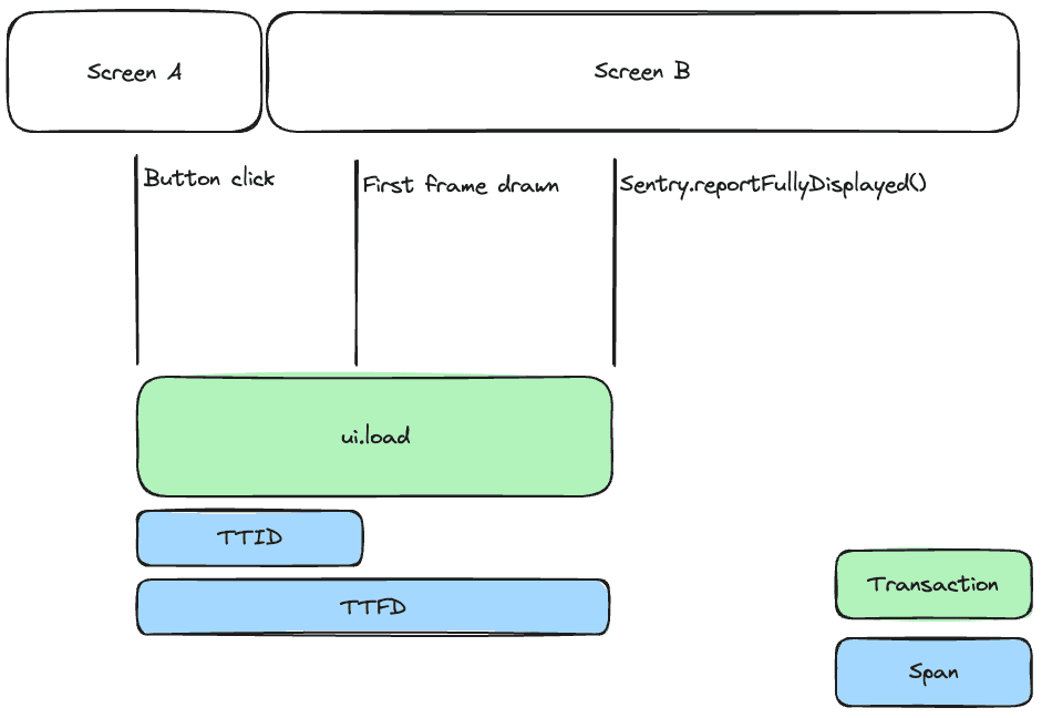 By adding a span for each launch of an activity, time to initial display (TTID) provides insight into how long it takes for your activities to launch and draw their first UI frame. The SDK sets the span operation to ui.load.initial-display and the span description to the activity's name, followed by initial display - for example, MainActivity initial display.
